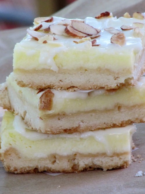 The almond cheesecake bars look tasty!