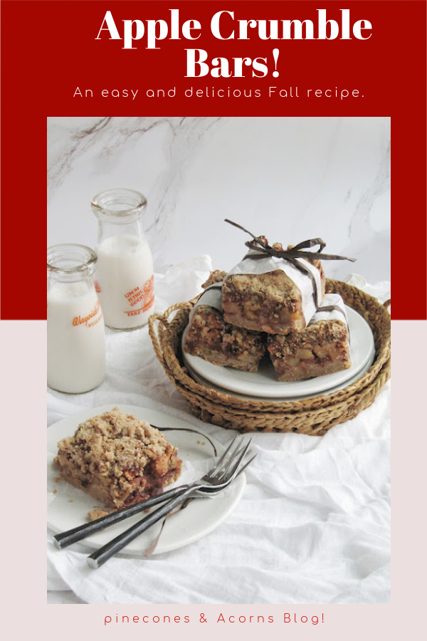 I love these apple crumble bars! When I made them Sunday I thought I would eat one and then give the rest to my neighbors, I am embarrassed to say I ate so many that there wasn’t much left to share. I guess I will have to make another pan and this time I will not even cut one piece to taste.