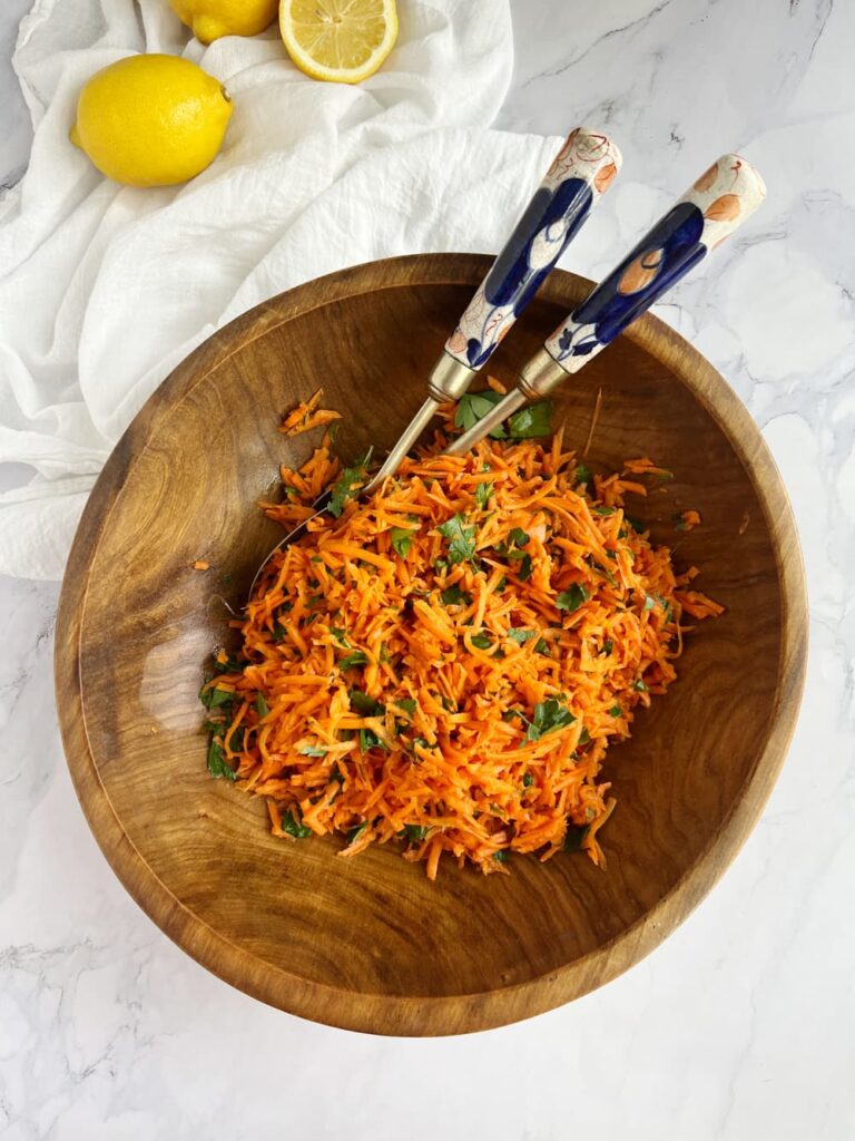 The salad I have been eating in Paris for thirty years and making at home ever since. Finely grated carrots, a bright lemon and Dijon dressing, fresh flat-leaf parsley and nothing more. It sounds too simple to be worth making until you make it and wonder why you have not been making it your entire life. It only gets better the longer it sits. The recipe is here.