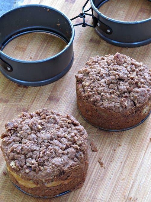 Make the crumble topping, combine the dark brown sugar, flour, butter, cinnamon and nuts. Use your fingers, a pastry blender or two knives to cut the butter into the dry ingredients and the mixture resembles small crumbles.