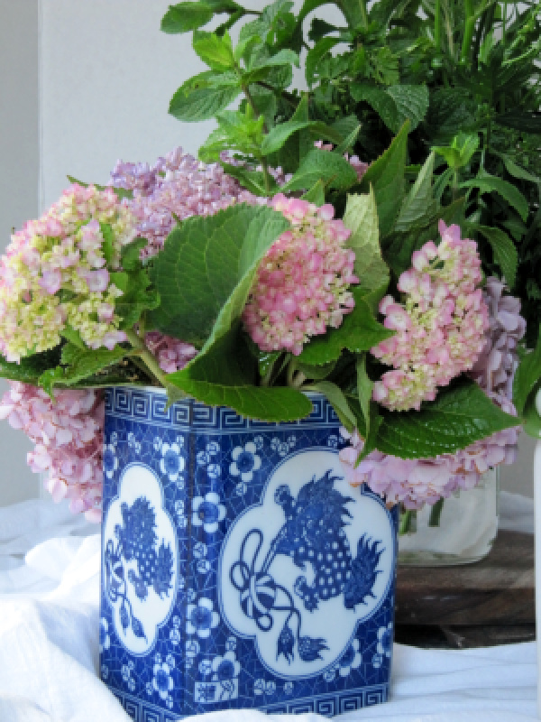 The second arrangement I added springs of mint to the hydrangeas from my yard. First I trimmed and arranged the flowers in my hand, then I tied them with a rubber-band so they would stay in place, next I filled the vase with warm water, then added the flowers. After finding the side of the bouquet that I like the best I added the mint. I made sure to add a few taller pieces as well as some trailing pieces of mint so that it looked a little like a vine snaking its way through the hydrangeas.