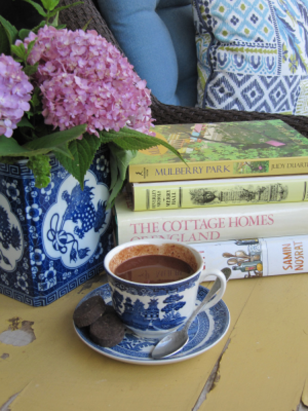 And last but not least I made a small posy of my favorite herbs, basil and mint. I simply placed spring of each in a small cup adding or subtracting until I like the size and shape, then I added water and placed the cup inside the white porcelain container.