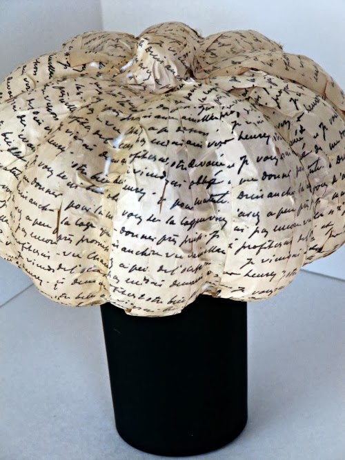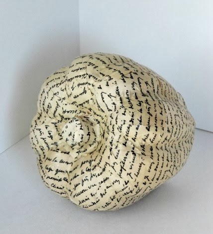 I copied some images, dyed them in black tea and then got to work glueing the strips of paper to my paper mache pumpkin.