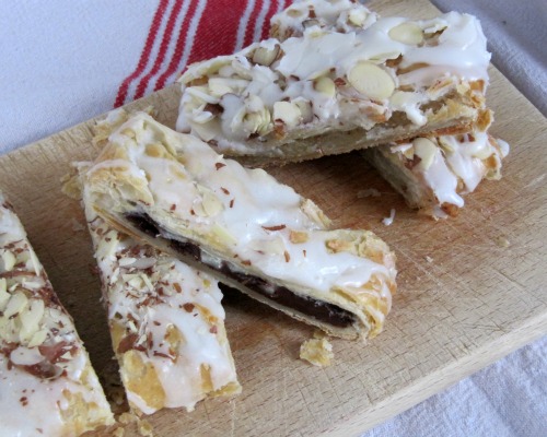 For chocolate pastry unfold puff pastry, lay chocolate bar in the center and fold the dough strips over the center chocolate alternating strips until you reach the end and then seal the ends.