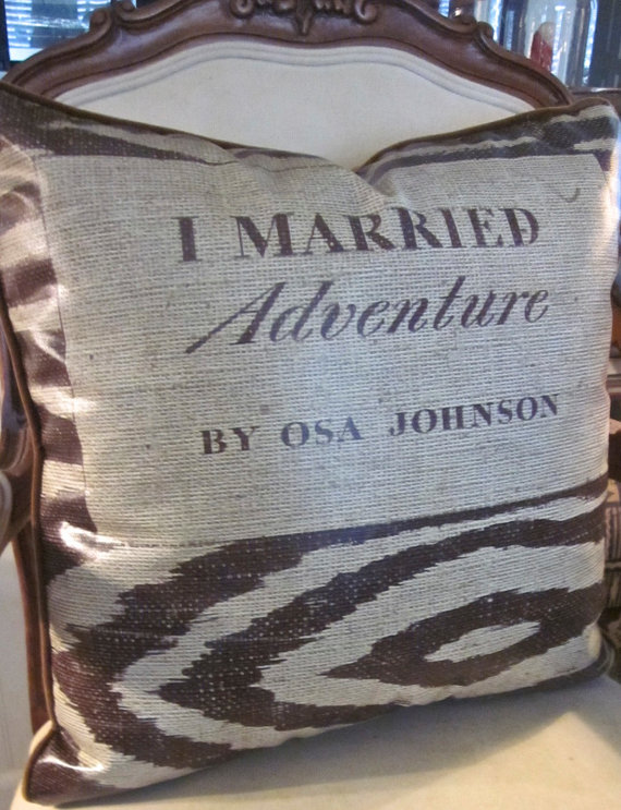 If you have been reading magazines or blogs for the last six hears, than you have seen copies of I Married Adventure by Osa Johnson, on tables, bookcases, and even made into handbags. Visit Art by Karena and find out a little about the story behind the book, as well as an opportunity to win the pillow below.