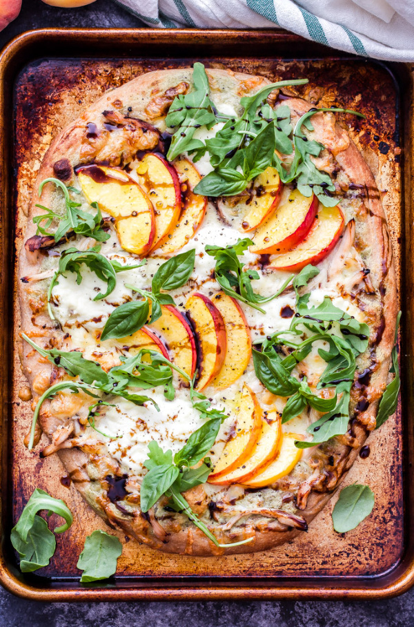 Peaches are in season and while I typically like to eat them by themselves I may try this Chicken Peach Ricotta Pizza with Balsamic Glaze.