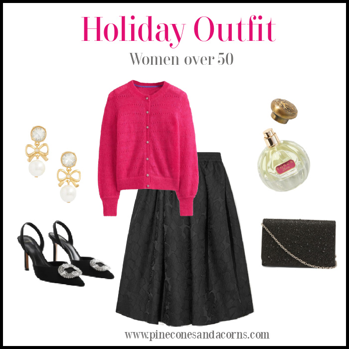 Add a little or a lot of sparkle to your holly outfit. The flower patterned black skirt is paired with a bright fuchsia pink sweater with sparkly buttons. It’s paired with a pair of festive sling backs and a sequence bag. Spritz on a little perfume and you are good to go.