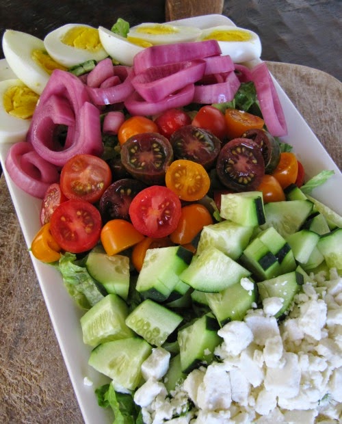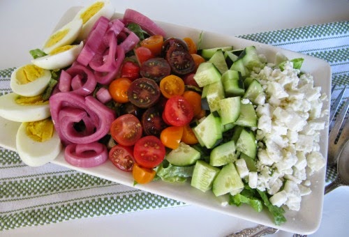 I made this salad this week,  a little twist on a Greek Salad, minus the black olives and the addition of hard boiled eggs for a little protein. Just add a little vinaigrette or your favorite salad dressing and you have the perfect lunch.