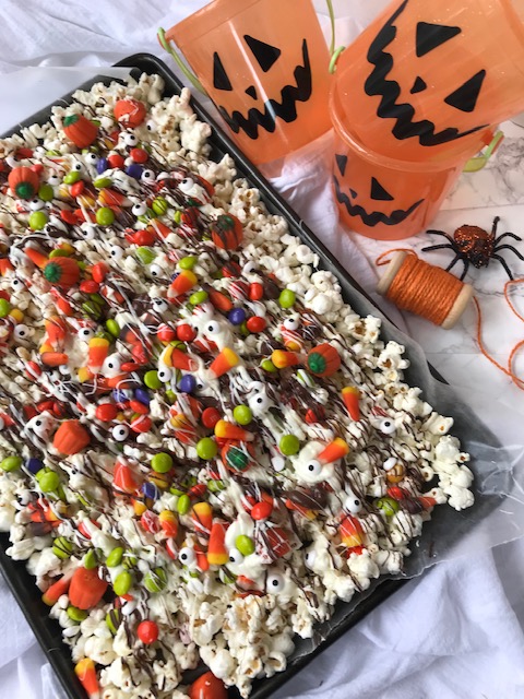 - Spread the popped popcorn and candy evenly on the baking sheet pan.