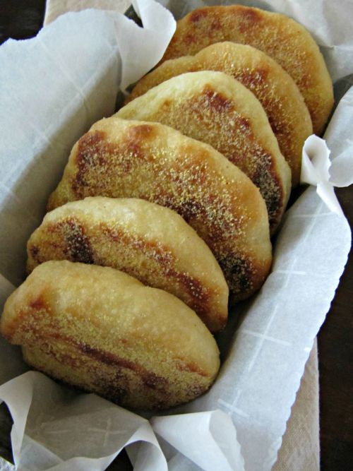 Sprinkle two baking sheets with corn meal and set aside. After the dough rises, punch it down and divide into 16 pieces. Roll each piece into a ball and then flatten into a 3″ disc. Place the discs on a baking sheet.