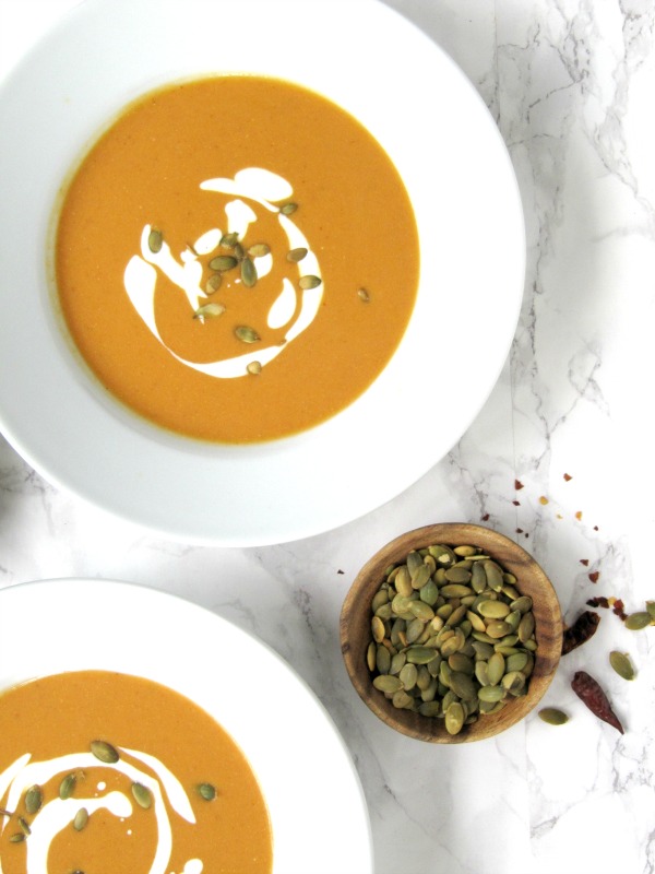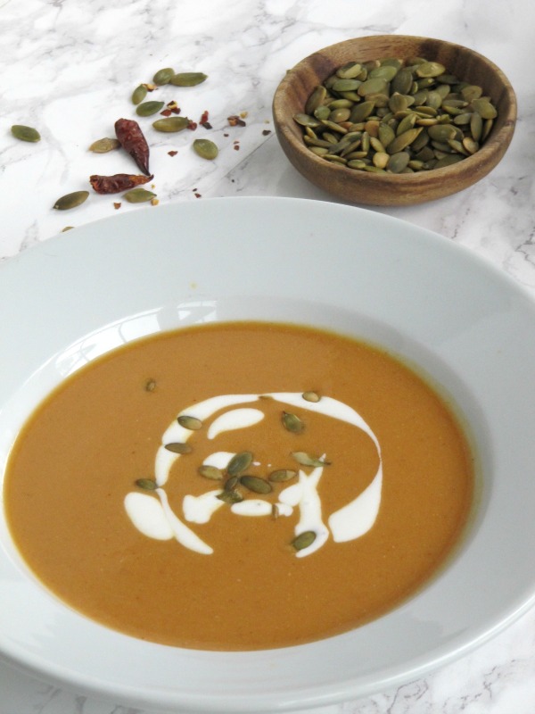 The soup definitely has a Thai or Asian flare to it and depending upon who many chili peppers you put in it has a little kick. It is a refreshing change from traditional pumpkin soup and I think you will enjoy it.