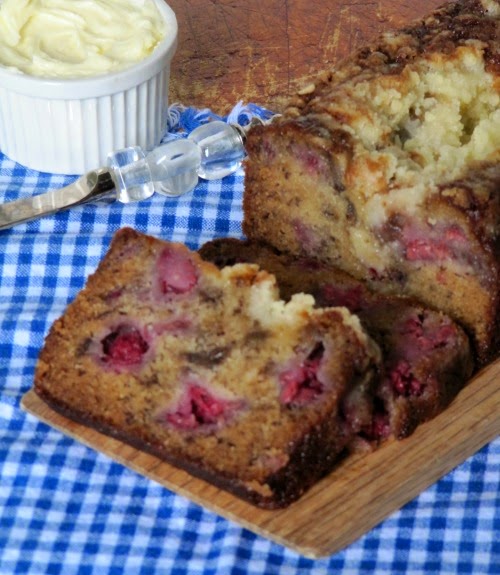 This banana bread is fabulous, it is moist, dense and has an extra special taste with the addition of the raspberries. I loved it! The only thing that would make it better is the addition of dark chocolate chunks. I think that may be my next loaf.