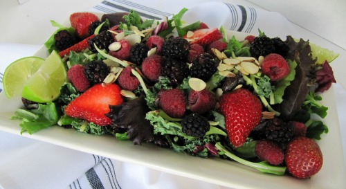 Wash all greens and dry, then wash berries. Mound the salad on a plate and sprinkle with the berries, top with almonds and a then add limes.
