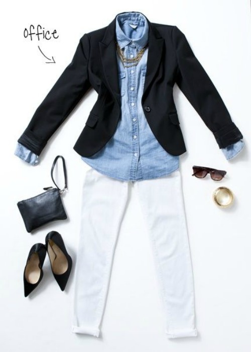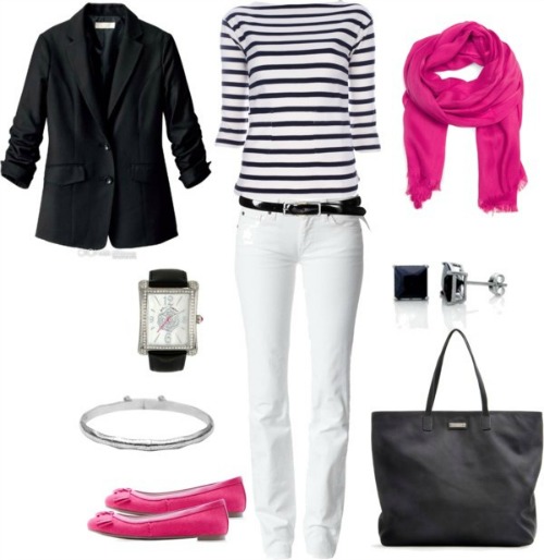 Fuchsia, green or yellow is  is a beautiful addition to your blue and white look. The bright and vibrant colors add a pop to your outfit and can be as simple as adding a scarf, shoes or even jewelry.
