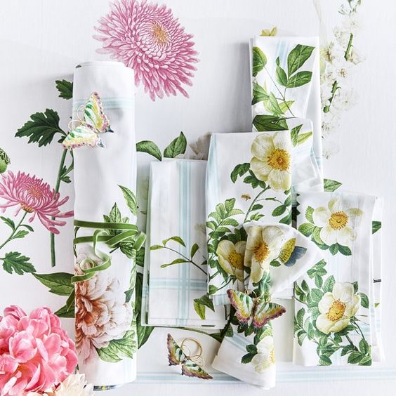 You could skip the dishes all together and add a touch of Spring to your table with just the linens. The botanical prints look like works of art.